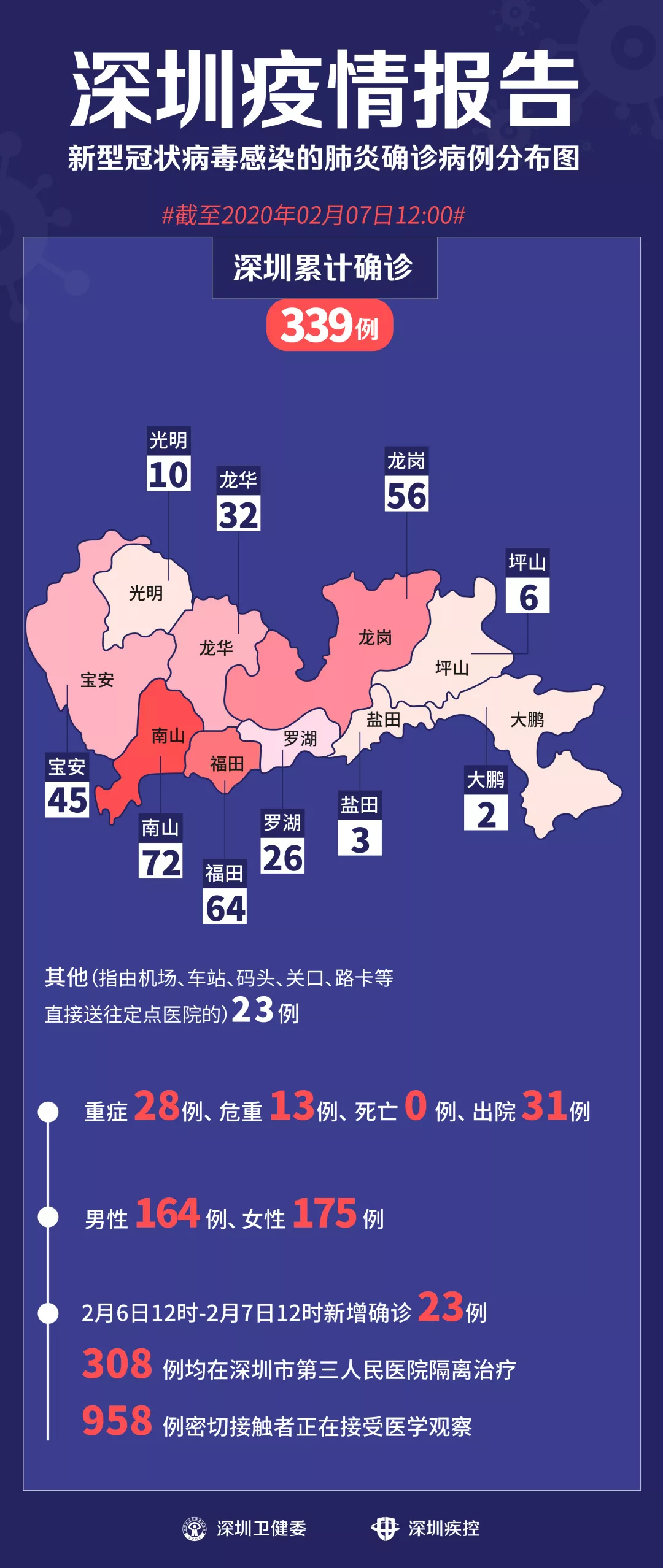 2月6日12時(shí)-2月7日12時(shí),深圳新增新型冠狀病毒感染的肺炎確診病例23例。