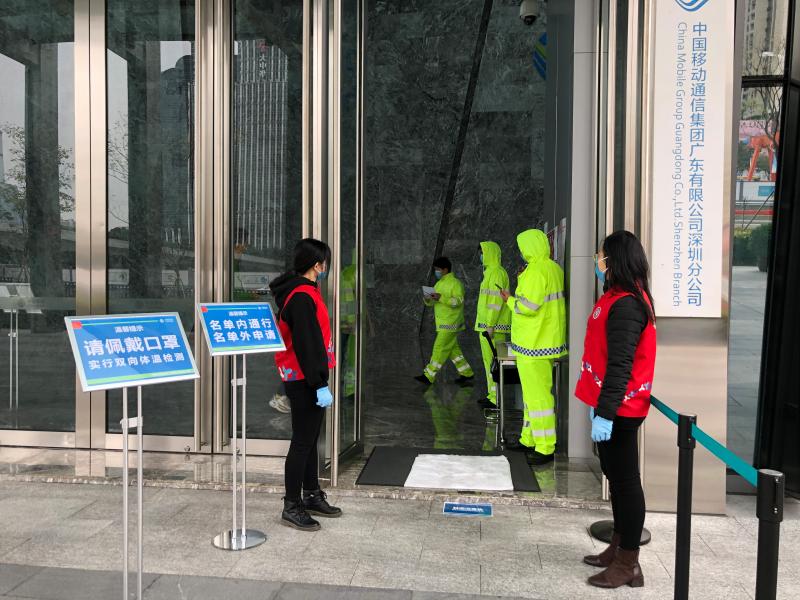 中國移動門口實(shí)行雙向體溫監(jiān)測,名單內(nèi)通行,名單外申請。