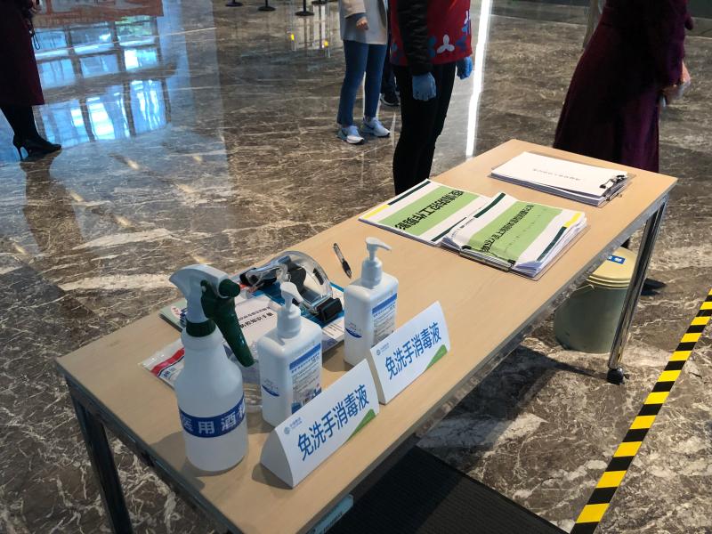 大堂門口放有免洗手消毒液、酒精等,進(jìn)出人員需要進(jìn)行登記。