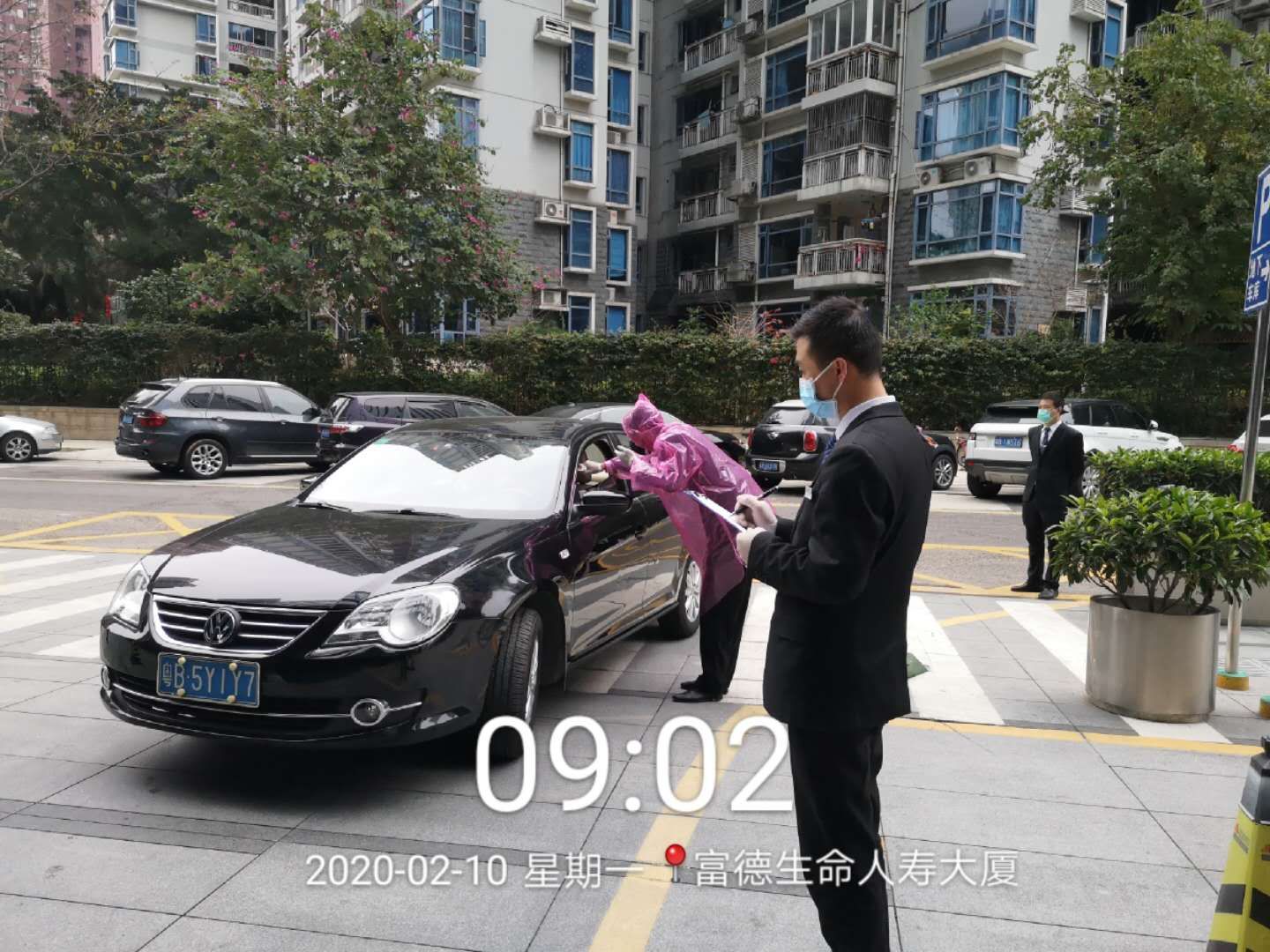 蓮花街道富德生命人壽大廈對進(jìn)入園區(qū)車輛駕駛員及乘客進(jìn)行體溫監(jiān)測及信息登記