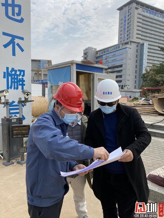 龍海波(左一)在“深圳版火神山”——市第三人民醫(yī)院二期工程臨時(shí)院區(qū)項(xiàng)目現(xiàn)場(chǎng)勘察供電線路。(蕭新敏 攝)