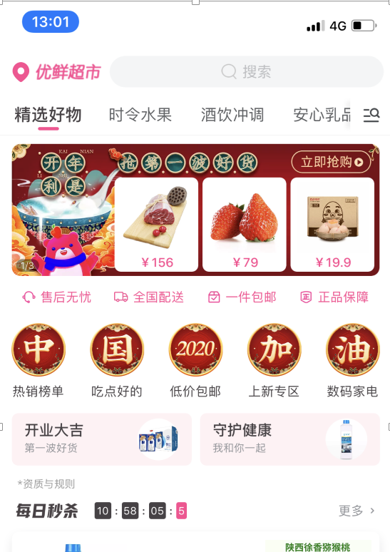 商品情況:除了生鮮日用品,母嬰用品、廚具電器都有。但春節(jié)需求旺盛,需提前搶購(gòu),可先看看自己所在地區(qū)是否提供配送。