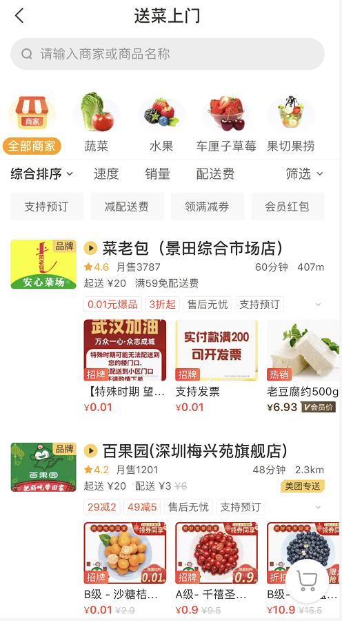 商品情況:未設(shè)買菜專區(qū),不過店鋪較多,商品豐富,市民可搜索菜品名字購(gòu)買。但多家門店休息中,暫時(shí)關(guān)閉了線上派送,可先看看自己所在地區(qū)是否提供配送。