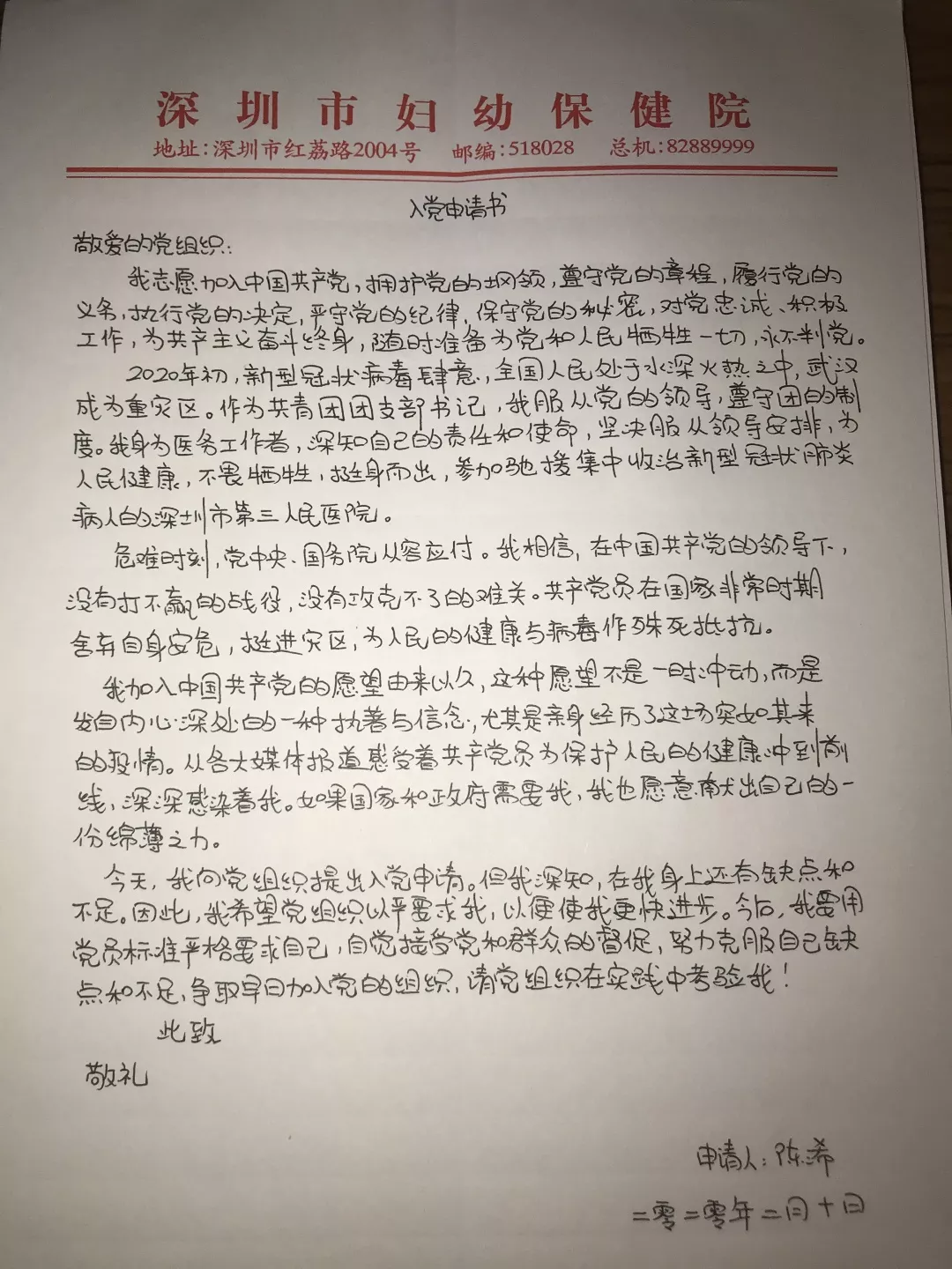 2月10日,陳浠在戰(zhàn)“疫”一線(xiàn)向組織提交了入黨申請(qǐng)書(shū),她表示要以實(shí)際行動(dòng)向身邊的共產(chǎn)黨員學(xué)習(xí),希望早日加入黨組織,在抗擊疫情的一線(xiàn),在今后的每一天,充分發(fā)揮黨員的先鋒模范作用。