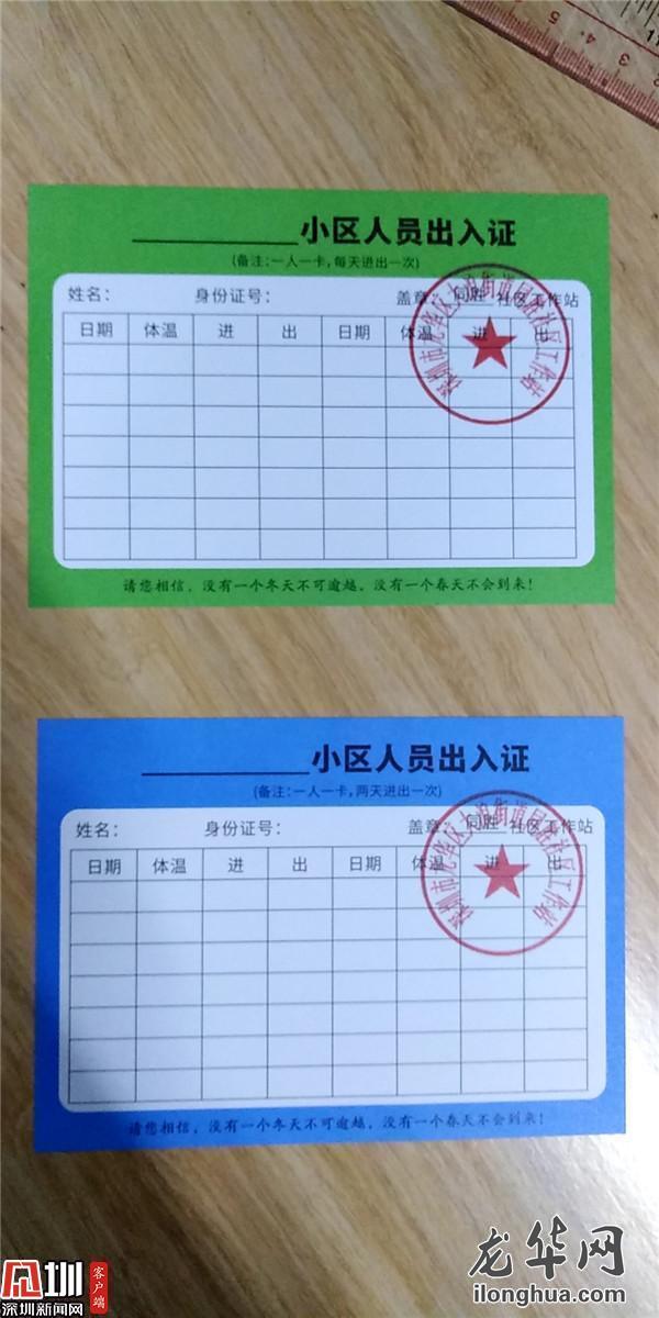 近日,根據(jù)不同居民的情況和需求,大浪街道用四種顏色的卡片對(duì)居民出入進(jìn)行分類管理:紅色是有發(fā)熱等異常癥狀、按要求正在居家隔離的人員,黃色是來深14天內(nèi),正在居家隔離且無異常癥狀的人員,可視情況轉(zhuǎn)為其他管理模式。紅、黃兩類人員嚴(yán)禁其出門,由社區(qū)工作站提供物資采購、幫送服務(wù)。藍(lán)色是沒有居家隔離、身體狀況正常的在家人員,憑證可以兩天出入1次;綠色是沒有居家隔離、身體狀況正常的上班人員,憑證每天可以出入1次。