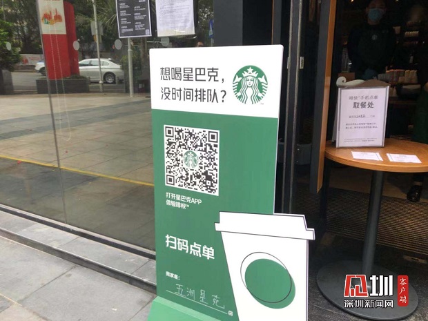 星巴克門前設(shè)置“掃碼點單”。