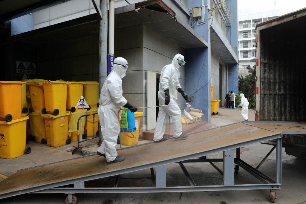 ▲卸完醫(yī)療廢物后,工作人員對(duì)堆放區(qū)域進(jìn)行消毒。