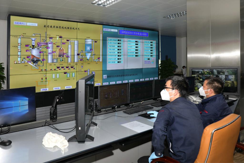 ▲工作人員通過(guò)實(shí)時(shí)影像監(jiān)測(cè)醫(yī)療廢物處置過(guò)程。