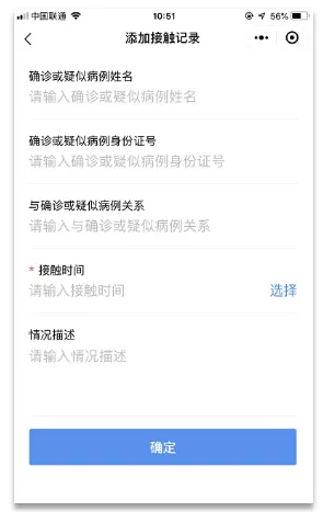 第三步:添加接觸記錄。若與確診或疑似病例有接觸過,需要添加接觸記錄,如有多次接觸記錄,可按實際填寫多條記錄。