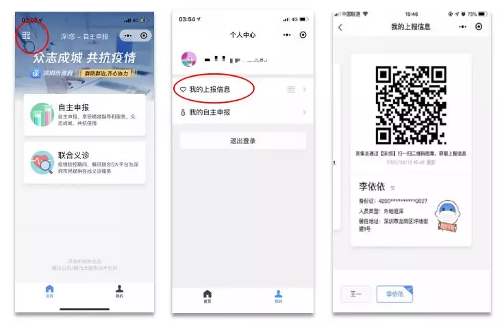 在進(jìn)出小區(qū)時,可在“深i您-自主申報”小程序首頁點擊左上角“二維碼圖標(biāo)”或前往“我的>個人中心”點擊“我的上報信息”向工作人員出示“深i您-自主申報”平臺生成的系統(tǒng)認(rèn)證圖碼,憑該圖碼出入小區(qū),無需作重復(fù)申報。