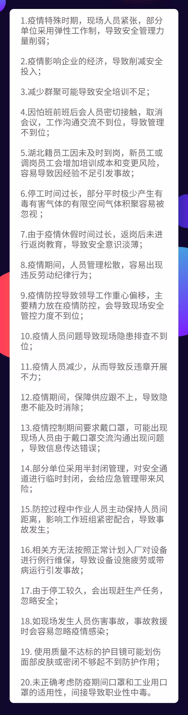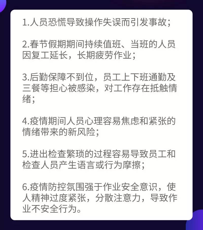 疫情防控和節(jié)后復(fù)產(chǎn)復(fù)工給企業(yè)安全生產(chǎn)帶來新挑戰(zhàn),如何做好防控措施?哪些風險又要防范?員工又如何自我保護?