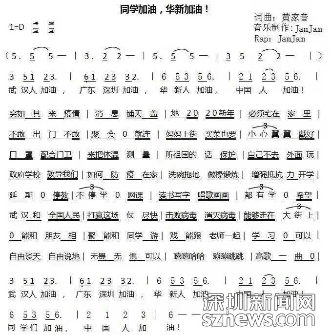 開學首日,深圳市福田區(qū)華新小學音樂教師黃家音作詞作曲《同學加油華新加油》祝福武漢,叮囑同學,而這,作為華新小學綠色校本課程的一個縮影,福田區(qū)教科院在線教學巡查員徐奇志老師在觀看后很是感動,她評價道:一樣的疫情,不一樣的開學第一課。福田區(qū)教科院音樂教研員楊岳軍老師則認為詞曲富有童趣,適合少兒,簡單通俗,易于傳唱。