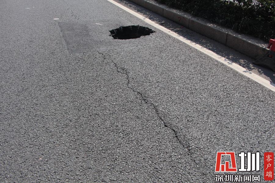 上午10點(diǎn)40分,記者在現(xiàn)場看到,該路面有一個直徑約一米、深約一米的坑口,旁邊還有一道長約20米的裂痕。工作人員正在使用雷達(dá)儀器對地面情況進(jìn)行勘測,同時該路段及靠深南大道一條車道已暫時被封鎖,福田區(qū)交警大隊(duì)也在現(xiàn)場指揮交通。據(jù)悉,該位置較臨近的地鐵2、3路線的站點(diǎn),一位深圳地鐵的工作人員告訴記者,目前該事故沒有對其線路運(yùn)行造成影響,也非先前修挖地鐵所致。