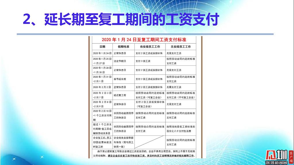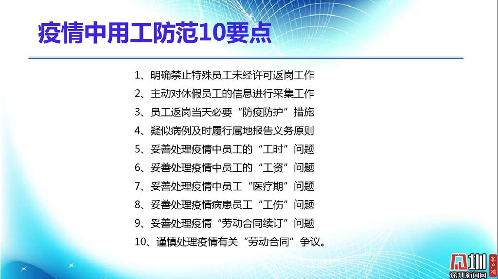 見圳客戶端?深圳新聞網(wǎng)2020年2月18日訊(見圳客戶端、深圳新聞網(wǎng)記者 焦慧茹)疫情影響了社會(huì)的方方面面,給企業(yè)和職工帶來了新的問題。對(duì)于廣大職工而言,擔(dān)心的是疫情期間工資發(fā)放、復(fù)工安排等。對(duì)于企業(yè)而言,擔(dān)心的是如何順利復(fù)工復(fù)產(chǎn)。為此,深圳市總工會(huì)聯(lián)合深圳新聞網(wǎng)推出“復(fù)工防疫微課堂”第六期,邀請(qǐng)講師楊文浩,分析、整理了疫情之下企業(yè)復(fù)工用工防范要點(diǎn),幫助大家解決困惑。
