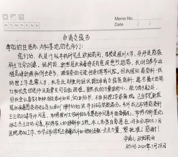 歐陽莉麗同學申請支援感染科一線的申請書