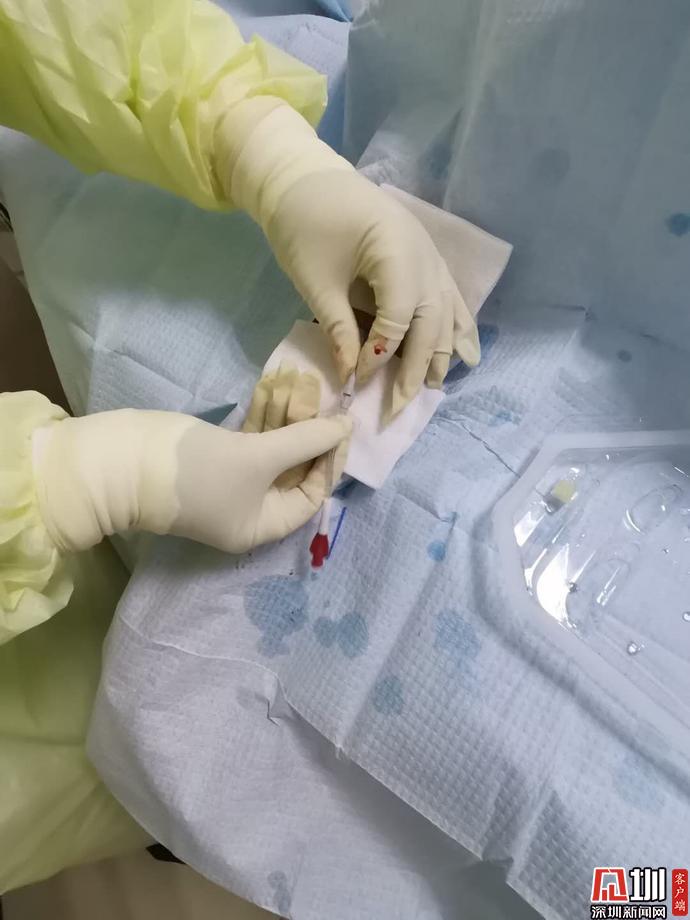 王玲是靜脈??浦委熥o(hù)士,另一名隊(duì)員陳潔麗也是持有 PICC 資格證的護(hù)士。盡管都有上十年的經(jīng)驗(yàn),對(duì)于此次操作兩人還是非常謹(jǐn)慎。王玲說,防護(hù)服帶來的影響,尤其會(huì)體現(xiàn)在手感上。戴上幾層手套后,手感會(huì)變差。受限于當(dāng)?shù)卦O(shè)備,可能不能靠儀器去協(xié)助穿刺,要執(zhí)行 " 盲穿 ",純憑自己的經(jīng)驗(yàn)去完成,是一個(gè)挑戰(zhàn)。等下先評(píng)估下血管條件,希望一切順利,為病人減輕痛苦。