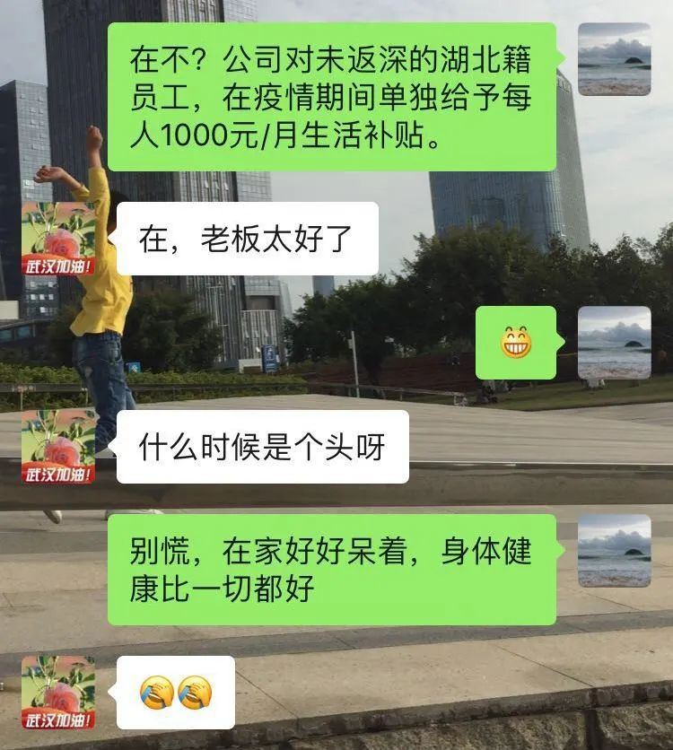 “工資已經(jīng)全額到賬,由于疫情影響,針對不能返程的湖北籍員工,每人額外發(fā)放1000元生活補(bǔ)貼?!?月17日,身在湖北公安的晏君收到公司通知后,懸著的心終于放了下來。晏君是深圳坤弘印務(wù)有限公司倉儲部記賬員,她坦言,公司發(fā)放的工資和生活補(bǔ)助是“雪中送炭”,過去近一個月心里確實很忐忑,既擔(dān)心沒工資發(fā),又害怕丟了工作,如今不用擔(dān)心經(jīng)濟(jì)來源了。“關(guān)鍵時候,公司不僅沒有拋棄我們,還給我們諸多關(guān)愛。我發(fā)現(xiàn)我更愛公司、更愛我的工作了?!?/p>
