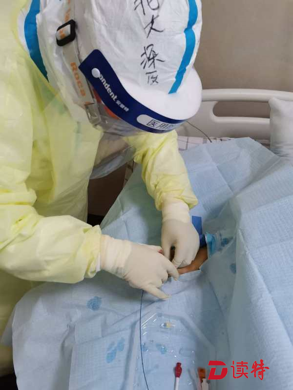 深圳醫(yī)療隊臨時黨支部書記王玲在監(jiān)利縣中醫(yī)院重癥病房為患者植入PICC導(dǎo)管。