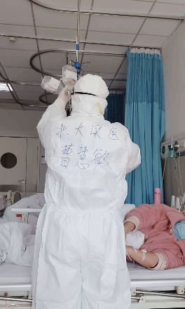 深圳醫(yī)療隊隊員曹慧敏在為患者服務(wù)。為了方便在“艙室”內(nèi)互相辨識,醫(yī)護(hù)人員都在自己的衣服上用記號筆寫上了名字。