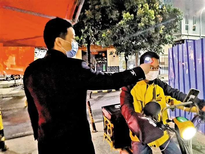 民治街道上芬社區(qū)網(wǎng)格員在卡點(diǎn)為進(jìn)出人員進(jìn)行體溫檢測。