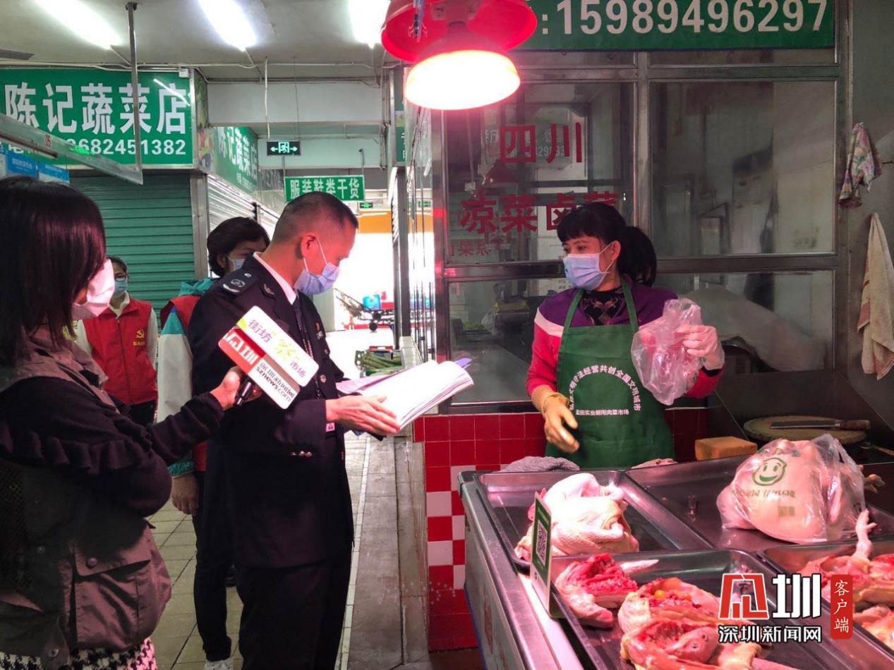 深圳市市場監(jiān)管局鹽田所執(zhí)法人員藍華榮表示,朝陽肉菜市場是從年初二開始營業(yè)的,鹽田所從年初二開始,每天都會對這個市場進行檢查。目前除了日常檢查之外,還會對市場的防疫防控工作進行檢查?!耙咔槠陂g主要檢查市場是否有售賣野味和商戶是否有佩戴口罩,當(dāng)?shù)谝淮伟l(fā)現(xiàn)商戶沒有戴口罩時,執(zhí)法人員會發(fā)放一份責(zé)令改正通知書給商戶,第二次還被發(fā)現(xiàn)沒有戴口罩的話,市監(jiān)部門將通知公安部門?!眻?zhí)法人員介紹道。
