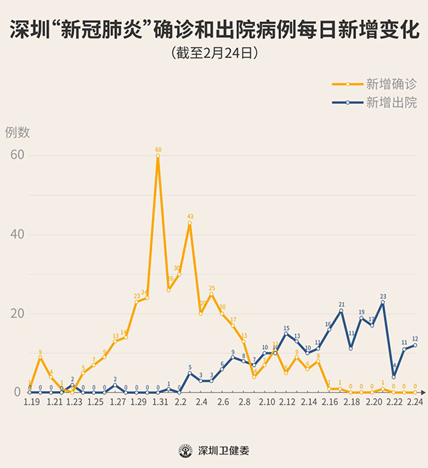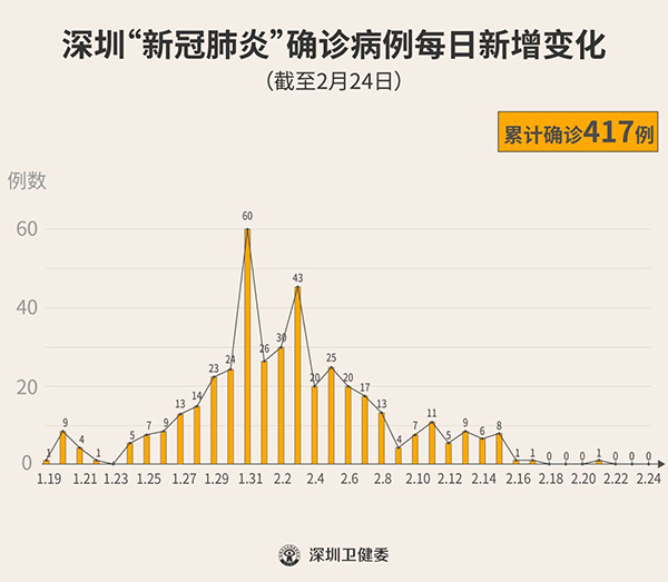 截至2月24日24時,深圳累計報告“新冠肺炎”確診病例417例。2月24日當(dāng)天全市無新增確診病例。