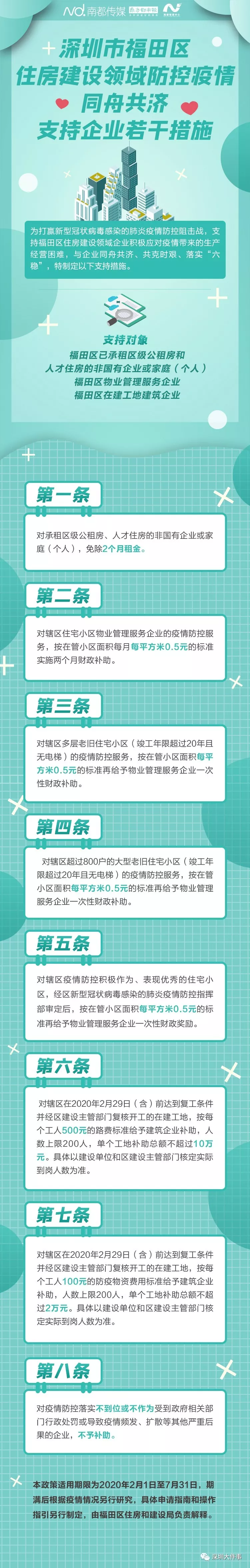 自深圳發(fā)布16條措施支持企業(yè)后,2月18日,福田區(qū)住房和建設(shè)局印發(fā)《深圳市福田區(qū)住房建設(shè)領(lǐng)域防控疫情同舟共濟(jì)支持企業(yè)若干措施》(下稱(chēng)《福田住建支持企業(yè)措施》)的通知,推出8條支持措施,以支持福田區(qū)住房建設(shè)領(lǐng)域企業(yè)積極應(yīng)對(duì)疫情帶來(lái)的生產(chǎn)經(jīng)營(yíng)困難。