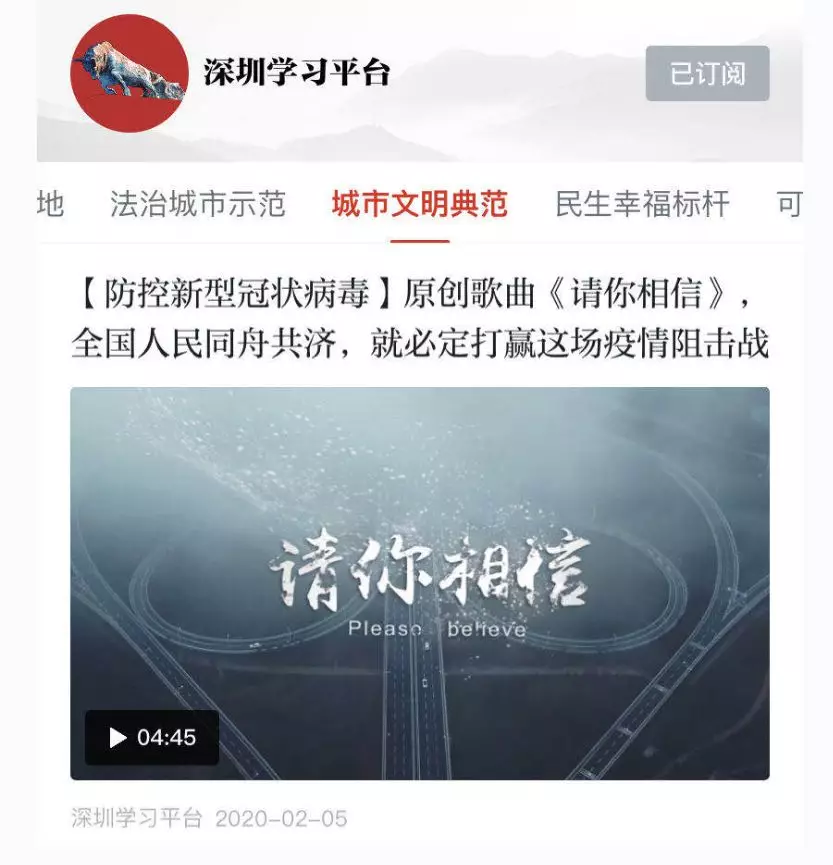 在深圳市委宣傳部的統(tǒng)一部署下,深圳的創(chuàng)作者們在短時間內創(chuàng)作出眾多暖人心、聚力量的作品,《請你相信》是首批推出的作品之一。2月5日,《原創(chuàng)歌曲<請你相信>,全國人民同舟共濟,就必定打贏這場疫情阻擊戰(zhàn)》視頻登上“學習強國”全國平臺“推薦”欄目,在朋友圈廣為傳播,反響良好。