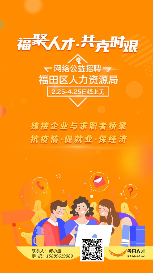 據(jù)悉,該公益網(wǎng)絡(luò)招聘將通過線上招聘會、在線直聊、視頻面試、人力資源管理信息系統(tǒng)等方式開展招聘專項活動,為福田區(qū)企業(yè)提供免費招聘服務(wù),嫁接企業(yè)與求職者的橋梁,助力福田經(jīng)濟盡快走出疫情影響,促進失業(yè)人員更快更好實現(xiàn)就業(yè)。本次活動承接單位為深圳今日人才信息科技有限公司,活動相關(guān)內(nèi)容會在福田區(qū)政府在線人力資源局網(wǎng)站、福田區(qū)微信公眾號上發(fā)布。