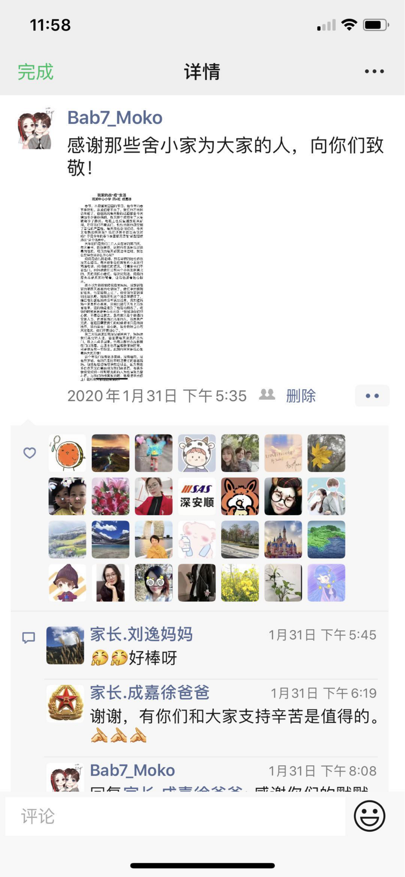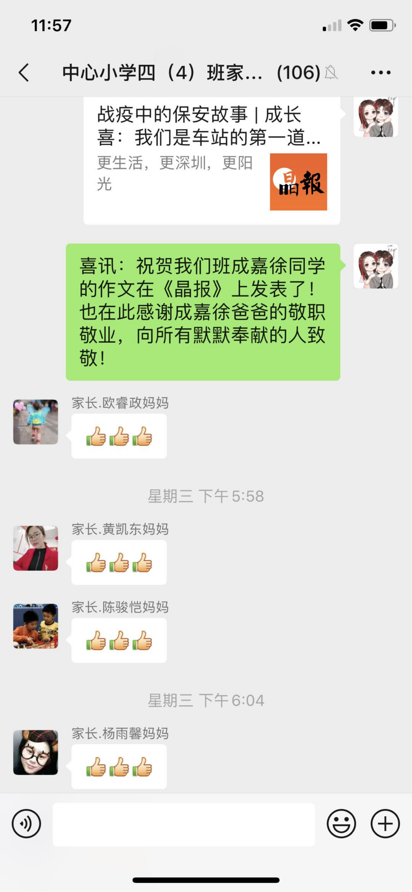 莫老師在班級群和朋友圈里分享學(xué)生發(fā)表的作文。
