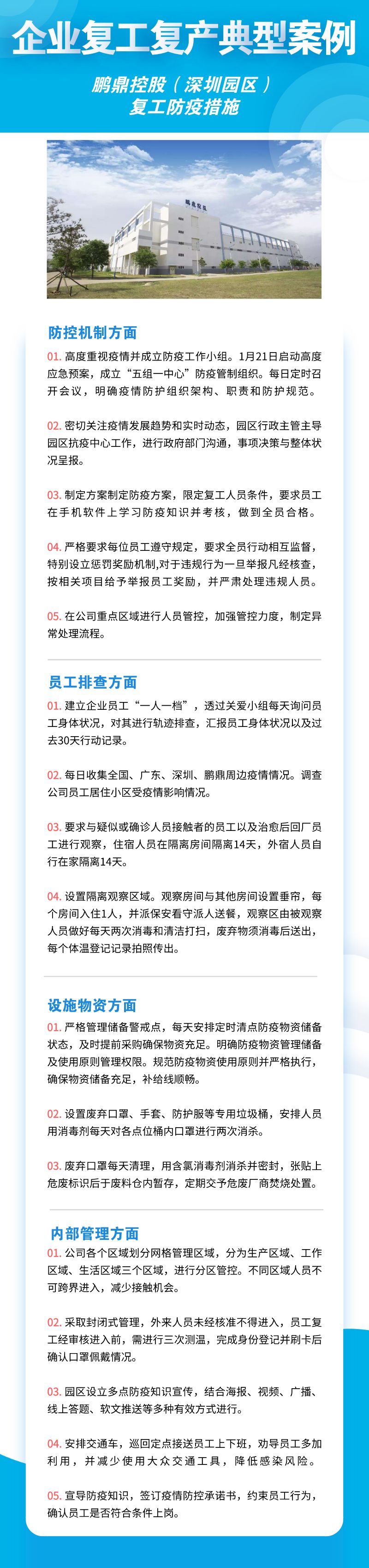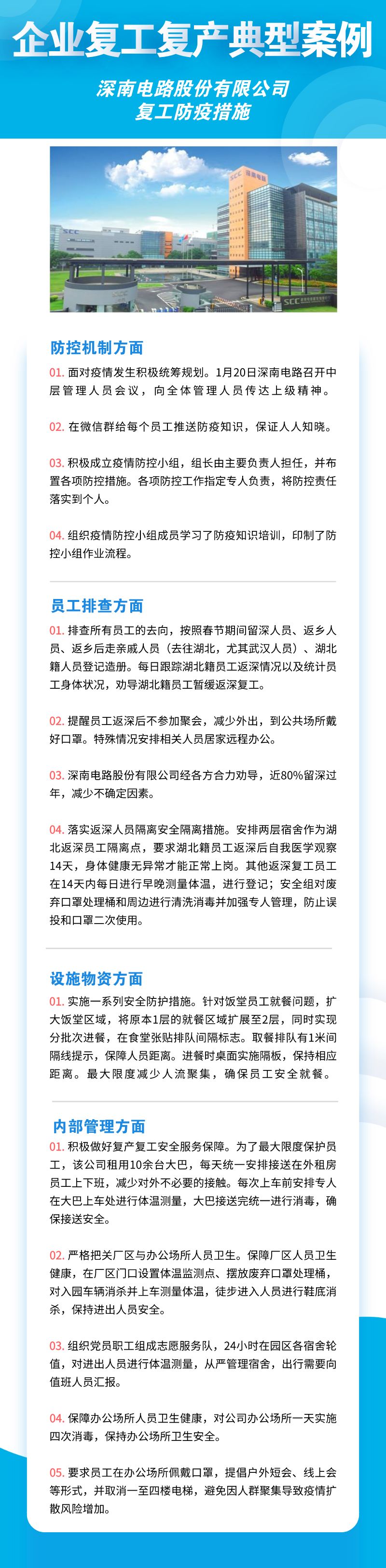 深圳市華為技術(shù)有限公司、聯(lián)想系統(tǒng)集成(深圳)有限公司、深南電路股份有限公司、比亞迪股份有限公司、創(chuàng)維集團(tuán)股份有限公司等8家公司,從防控機(jī)制、員工排查、設(shè)施物資、內(nèi)部管理四個(gè)方面來落實(shí)疫情防控措施,包括成立企業(yè)疫情防控小組、建立企業(yè)防控機(jī)制、提升員工防控意識(shí)、劃分隔離區(qū)域、宿舍食堂等區(qū)域消殺等舉措。