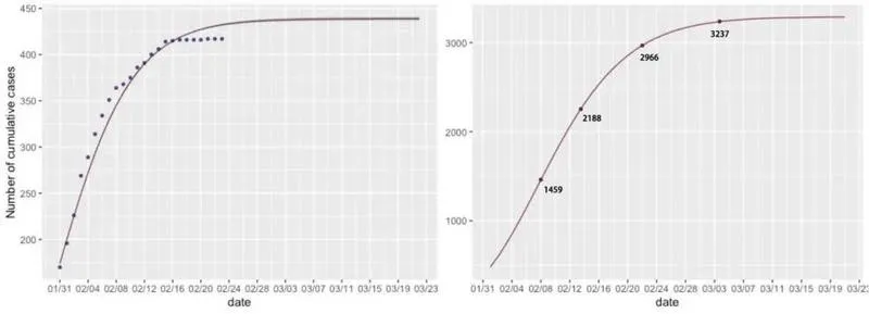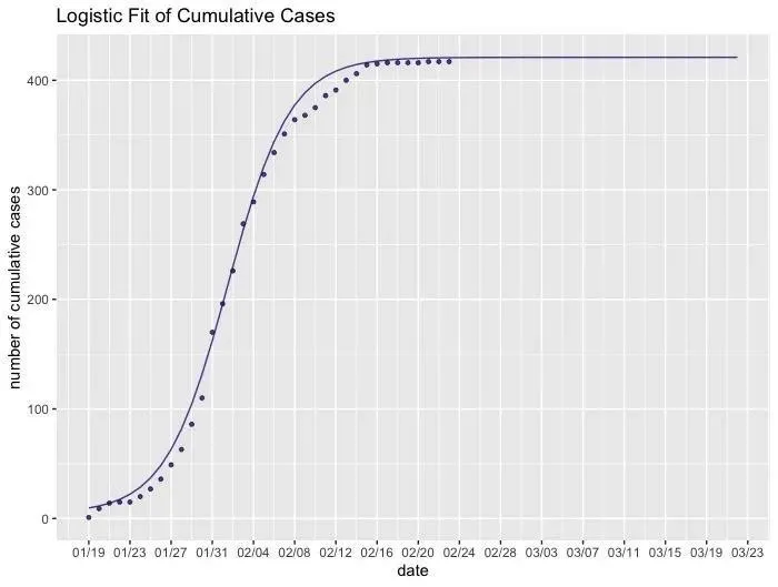 進(jìn)一步地擬合深圳新冠肺炎的累計確診人數(shù),并對累計確診人數(shù)做出預(yù)測??梢钥吹?,模型預(yù)測自2月28日起病例數(shù)不再增加,預(yù)測得到最終的累計確診人數(shù)收斂在422人左右。