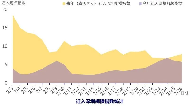 年前,深圳人口達(dá)2000萬人,春節(jié)期間最低830多萬人。從百度地圖遷徙-春運(yùn)期間遷入深圳趨勢可以看到,相比去年,年后遷入深圳規(guī)模較去年一直呈現(xiàn)平穩(wěn)的低態(tài)勢,但在2月9日呈現(xiàn)出一波返程小高峰,2月14日,在深人數(shù)約1300萬人,目前約1600萬人,也就是說年后至今約有七百多萬人從外地返回深圳。