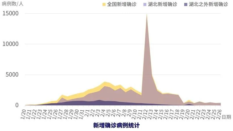 目前每日新增確診病例呈下降趨勢。2月3日,非湖北地區(qū)新增確診病例達(dá)到最高峰890例,之后逐漸下降(2月20日監(jiān)獄系統(tǒng)新增確診病例,造成數(shù)據(jù)波動),2月26日新增確診病例降至24例,為最高峰的2.7%,前一天新增病例5例,僅為最高峰的0.56%。湖北地區(qū)新增確診病例在2月4日達(dá)到最高峰3156例(2月12日,2月13日,由于確診標(biāo)準(zhǔn)的改變,造成數(shù)據(jù)波動),隨后基本呈下降趨勢,2月26日新增確診409例,為最高峰的12.96%。