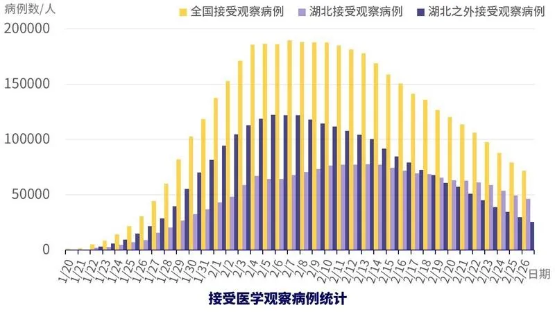 還值得關(guān)注的是正在接受醫(yī)學(xué)觀察的人數(shù),在全國嚴(yán)格管控的情況下,未來新增確診病例很大比例會來自這部分人群。從數(shù)據(jù)中可以看到,非湖北地區(qū)接受醫(yī)學(xué)觀察人數(shù)正在快速下降,湖北地區(qū)的也在穩(wěn)步下降中,這可能預(yù)示著未來新增確診病例也將下降。