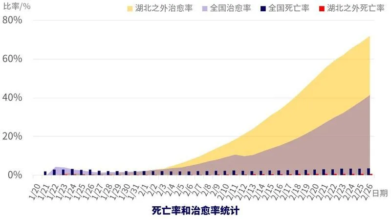 治愈率遠(yuǎn)超死亡率。截至2月26日,非湖北地區(qū)治愈率已達(dá)72%,死亡率為0.8%。全國治愈率也在不斷提升,與死亡率之間的距離快速拉大,2月26日,全國治愈率41.4%,死亡率3.5%。