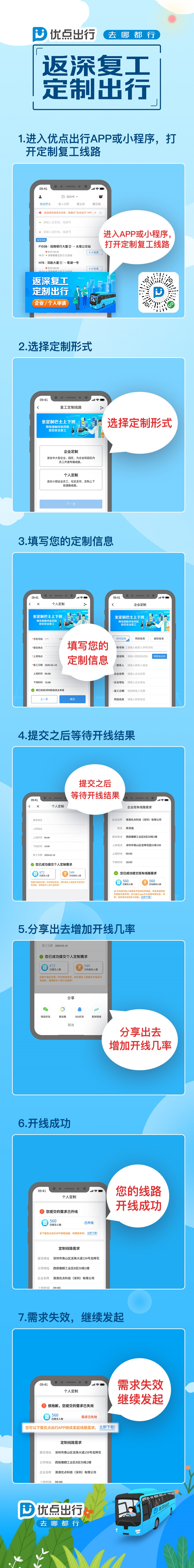 復(fù)工企業(yè)和個(gè)人在“優(yōu)點(diǎn)出行”APP或“優(yōu)點(diǎn)巴士”小程序中提交申請、填寫復(fù)工出行需求,由優(yōu)點(diǎn)出行平臺聚合生成復(fù)工專線并通知乘客,深圳巴士集團(tuán)提供安全消毒的車輛進(jìn)行乘客運(yùn)輸。