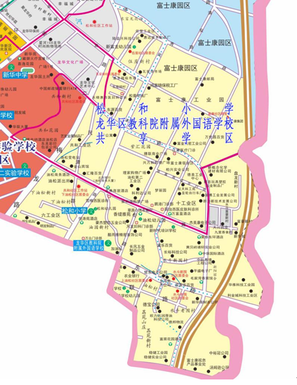 龍華區(qū)教育科學研究院附屬外國語學校小學部與松和小學、初中部與新華中學共享學區(qū)范圍,兩校在共享學區(qū)范圍內(nèi)統(tǒng)籌招生。