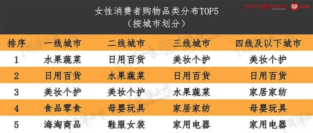 ▲在各個(gè)地區(qū),美妝個(gè)護(hù)、日用百貨類的商品都是女性消費(fèi)者的最愛(ài)