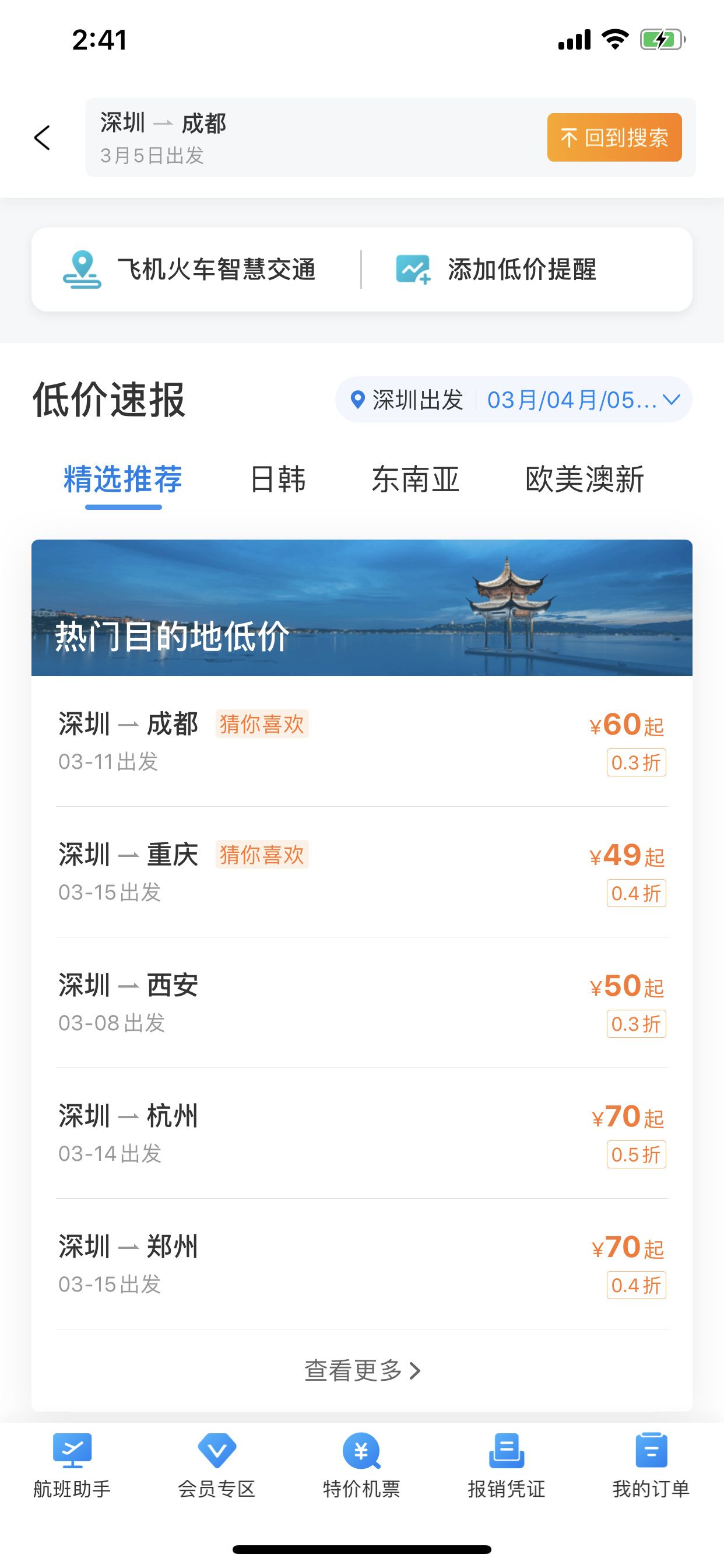 3月5日,記者在飛豬、攜程等第三方機票預訂平臺看到,近日從深圳飛往重慶、成都等地的多條航線,兩位數的“白菜價”機票比比皆是,如深圳飛重慶機票本身價格才49元,低價一直持續(xù)到3月底。一平臺客服告訴記者,票價真實,這是航空公司的定價。