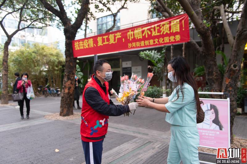 見(jiàn)圳客戶(hù)端·深圳新聞網(wǎng)2020年3月6日訊 3月6日上午,春暖花開(kāi),萬(wàn)物更新。華僑城創(chuàng)意文化T街入口,進(jìn)入園區(qū)上班的員工除了接受體溫檢測(cè)、出示入園卡等常規(guī)動(dòng)作外,女員工意外收到了一束鮮花和一張“三八”節(jié)賀卡,賀卡上寫(xiě)著:帶著溫柔堅(jiān)定的力量抗“疫”前行!這是園區(qū)黨員志愿者對(duì)“抗擊疫情、復(fù)工復(fù)產(chǎn)”中廣大女職工的禮贊。