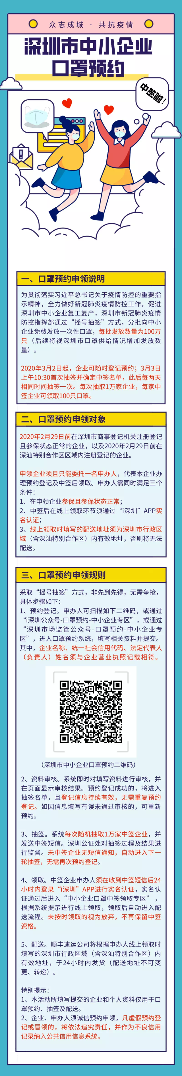南方網(wǎng)2020年3月6日訊 好消息!深圳市中小企業(yè)可以預約申領口罩啦!2020年2月29日前在深圳市深汕特別合作區(qū)區(qū)域內注冊登記的企業(yè),均可以預約申領!配送地址必須是深圳市行政區(qū)域(含深汕特別合作區(qū)),免費包郵哦!