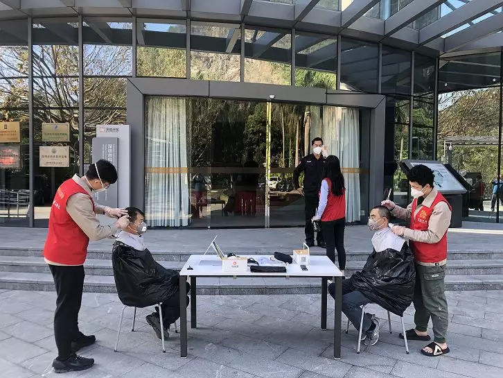 公司本部,1303會議室,臨時理發(fā)室“生意”也火爆極了。公司工會邀請了兩名專業(yè)的Tony老師,為近90名員工提供免費(fèi)的理發(fā)服務(wù)。為減少人員聚集,理發(fā)采取提前線上預(yù)約,分時段進(jìn)行,確保安全的同時,盡可能讓有需要的同事都能理上發(fā)。鋪上一次性地毯,坐上椅子,圍上一次性“斗篷”,Tony老師一頓熟練的剪發(fā)操作后,再用吹風(fēng)機(jī)整好造型,就完成了理發(fā)的全過程。臨時理發(fā)師的搭建,有效解決了員工生活上的困難,幫助他們以良好的精神面貌投入工作來。