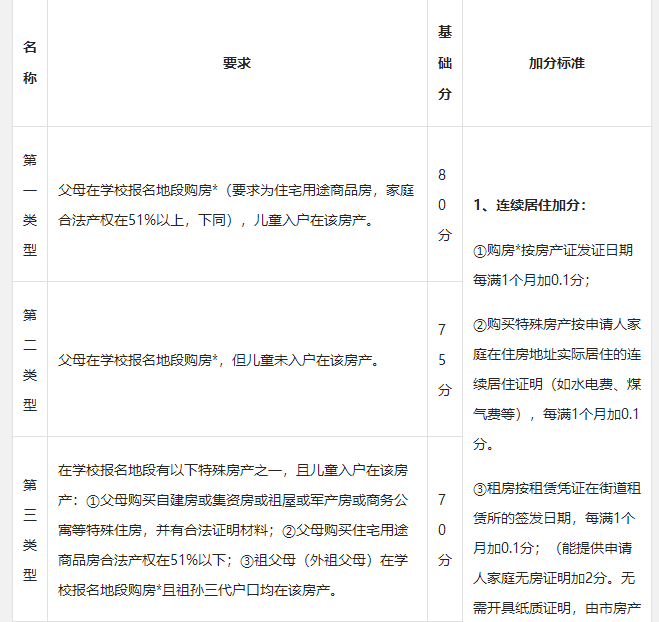 自購商品房:父母、祖父母、外祖父母或法定監(jiān)護人在申請學校學區(qū)內購商品房或安居商品房,家庭合法產權份額在51%以上,按房產證(或不動產權證)購買日期每滿一個月加0.1分,商品房或安居商品房購房合同不積分。