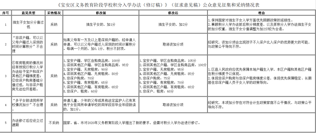 在新修訂稿中,寶安區(qū)教育局結合市民意見反饋,擬將獨生子女加分由1分調整至2分,并取消兩項加分項,同時對部分情況分值進行調整,以體現積分梯度。