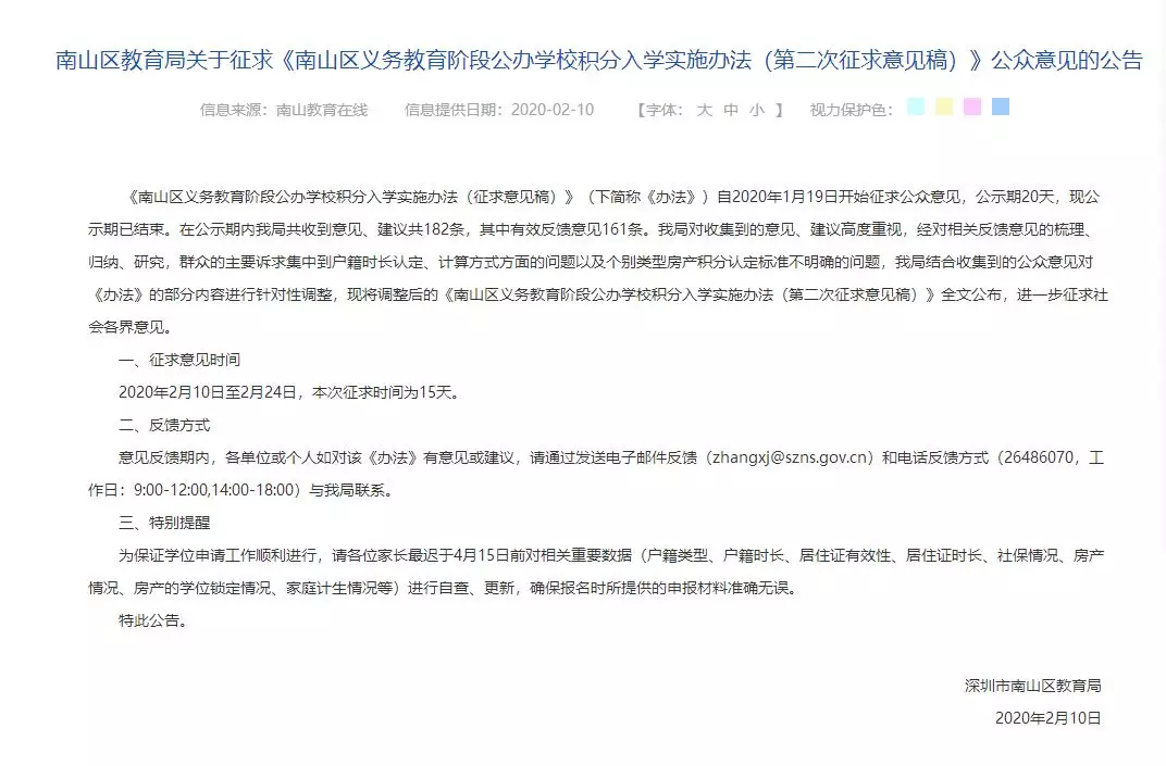 1月19日,南山區(qū)教育局第一次征求意見發(fā)出后,共收集到關于積分算法調整的反饋意見182條,并于2月10日第二次發(fā)布《南山區(qū)義務教育階段公布學校積分入學實施辦法》征求意見稿(以下簡稱《意見》),根據《意見》內容,擬調整2020年積分入學辦法。