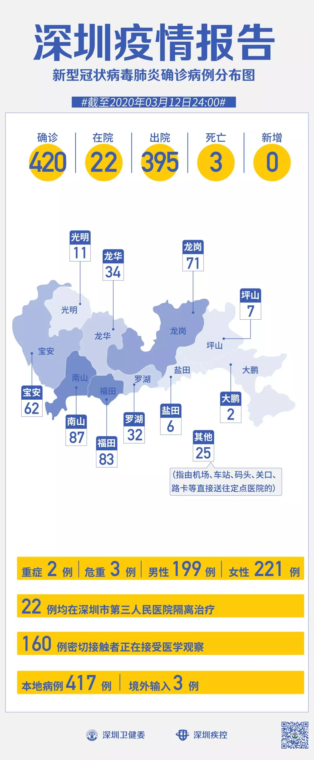 截至3月12日24時(shí),深圳累計(jì)報(bào)告“新冠肺炎”確診病例420例。3月12日當(dāng)天全市無(wú)新增確診病例,當(dāng)天出院病例3例。
