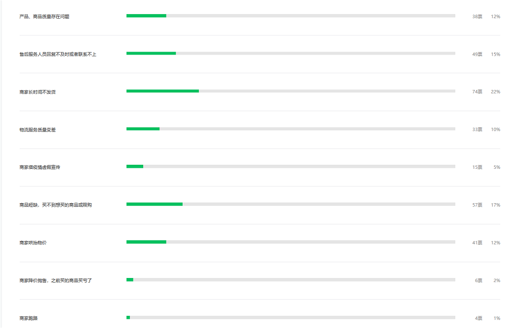 不少市民表示,疫情期間“在線消費(fèi)”遇到過問題。其中,長(zhǎng)時(shí)間不發(fā)貨、因商品短缺或限購(gòu)買不到商品、售后服務(wù)人員回復(fù)不及時(shí)或聯(lián)系不上位列市民消費(fèi)不滿意榜前三;而商品質(zhì)量存在問題、商家哄抬物價(jià)則并列消費(fèi)不滿意榜第四。
