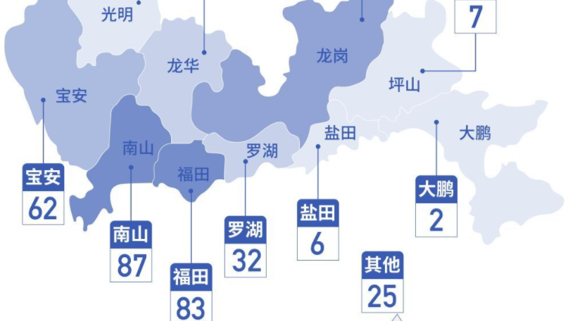 按照病例管理地區(qū)劃分,南山區(qū)87例、福田區(qū)83例、龍崗區(qū)71例、寶安區(qū)62例、龍華區(qū)34例、羅湖區(qū)32例、光明區(qū)11例、坪山區(qū)7例、鹽田區(qū)6例、大鵬新區(qū)2例、其他(指由機(jī)場(chǎng)、車站、碼頭、關(guān)口、路卡等直接送往定點(diǎn)醫(yī)院的)26例。