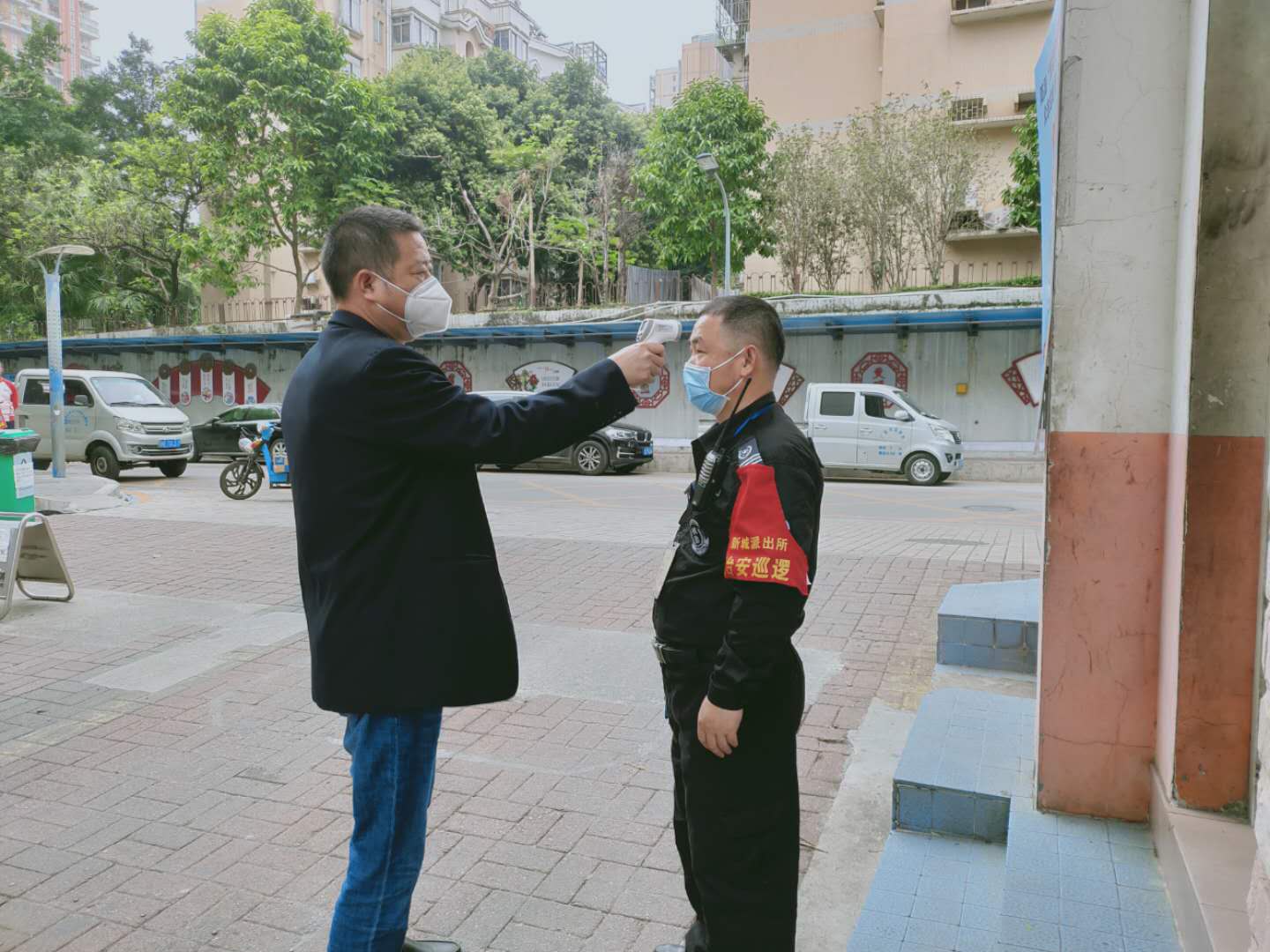 曾志軍為小區(qū)工作人員測量體溫